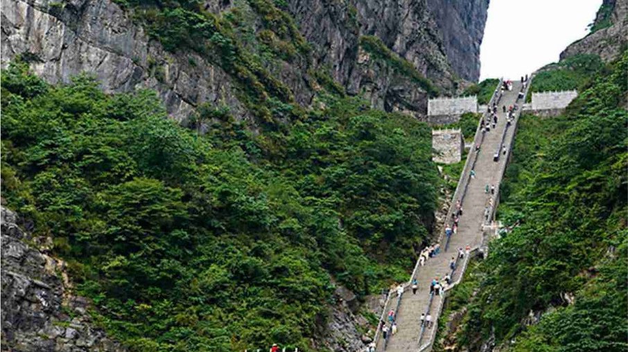 A Montanha Tianmen não é famosa apenas pela escadaria. A subida até o topo já é uma atração, feita por um dos teleféricos mais longos do mundo.